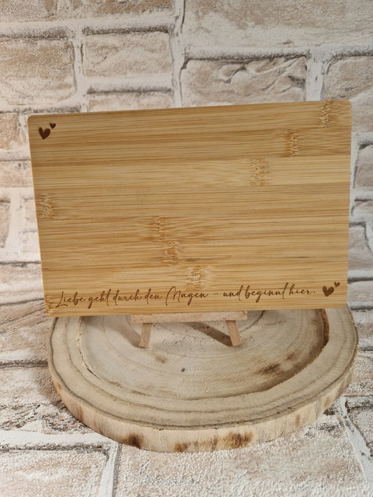 Graviertes Bambus Schneidebrett „Liebe geht durch den Magen“ – Frühstücksbrett 23 x 15 cm