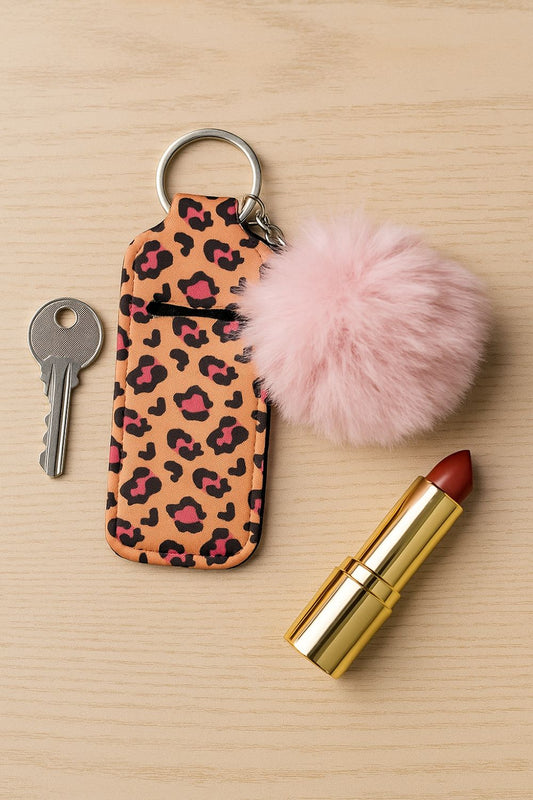 Stylisches Schlüsselband aus Neopren mit Lippenstifthalter & Pom Pom – Animalprint in Rosa/Pink