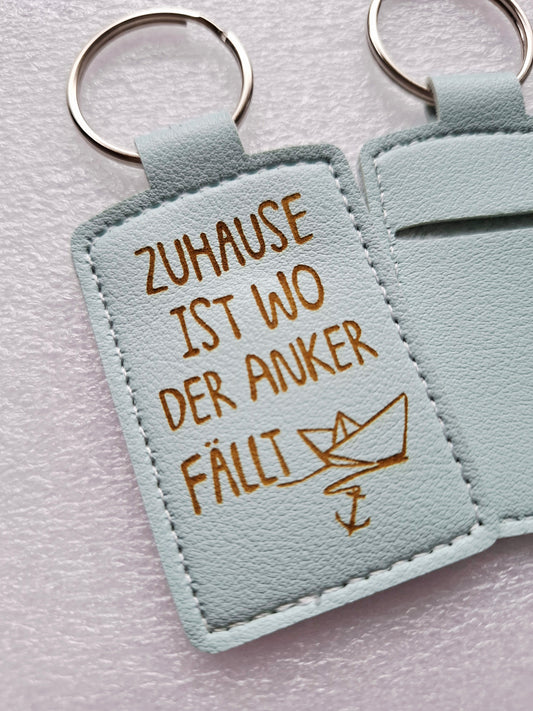 Schlüsselanhänger aus Kunstleder mit Lasergravur – „Zuhause ist wo der Anker fällt“ – himmelblau, praktisch mit Chip-Aufbewahrung