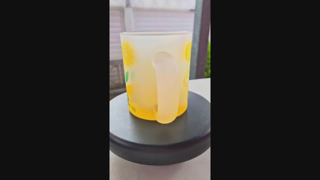 Diese satinierte Glastasse mit einem lebendigen Farbverlauf und einem Rundumdruck mit frischen Zitronen zieht alle Blicke auf sich. Mit einem Fassungsvermögen von 300 ml ist der Becher perfekt für Sommergetränke und sorgt für gute Laune.