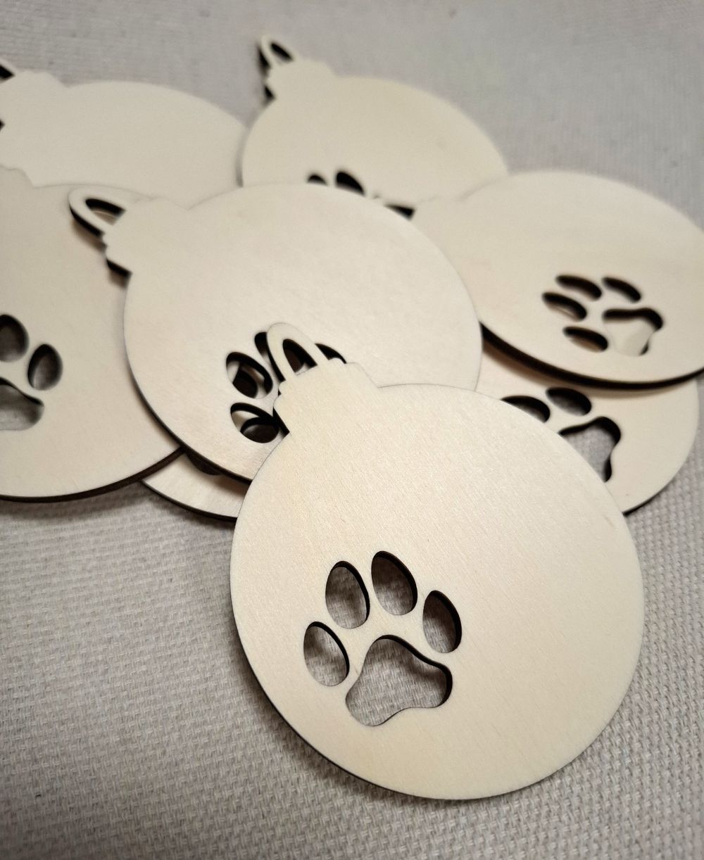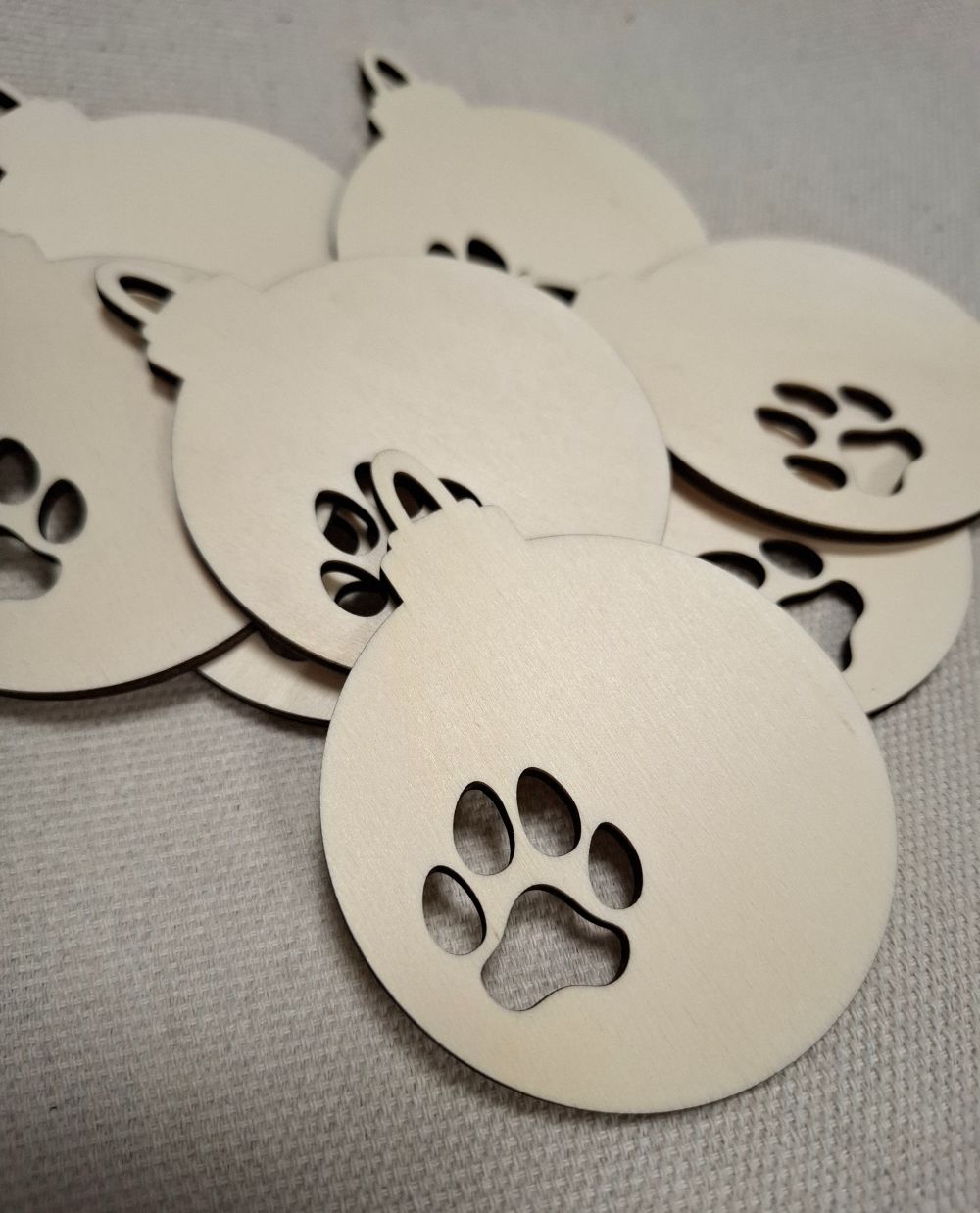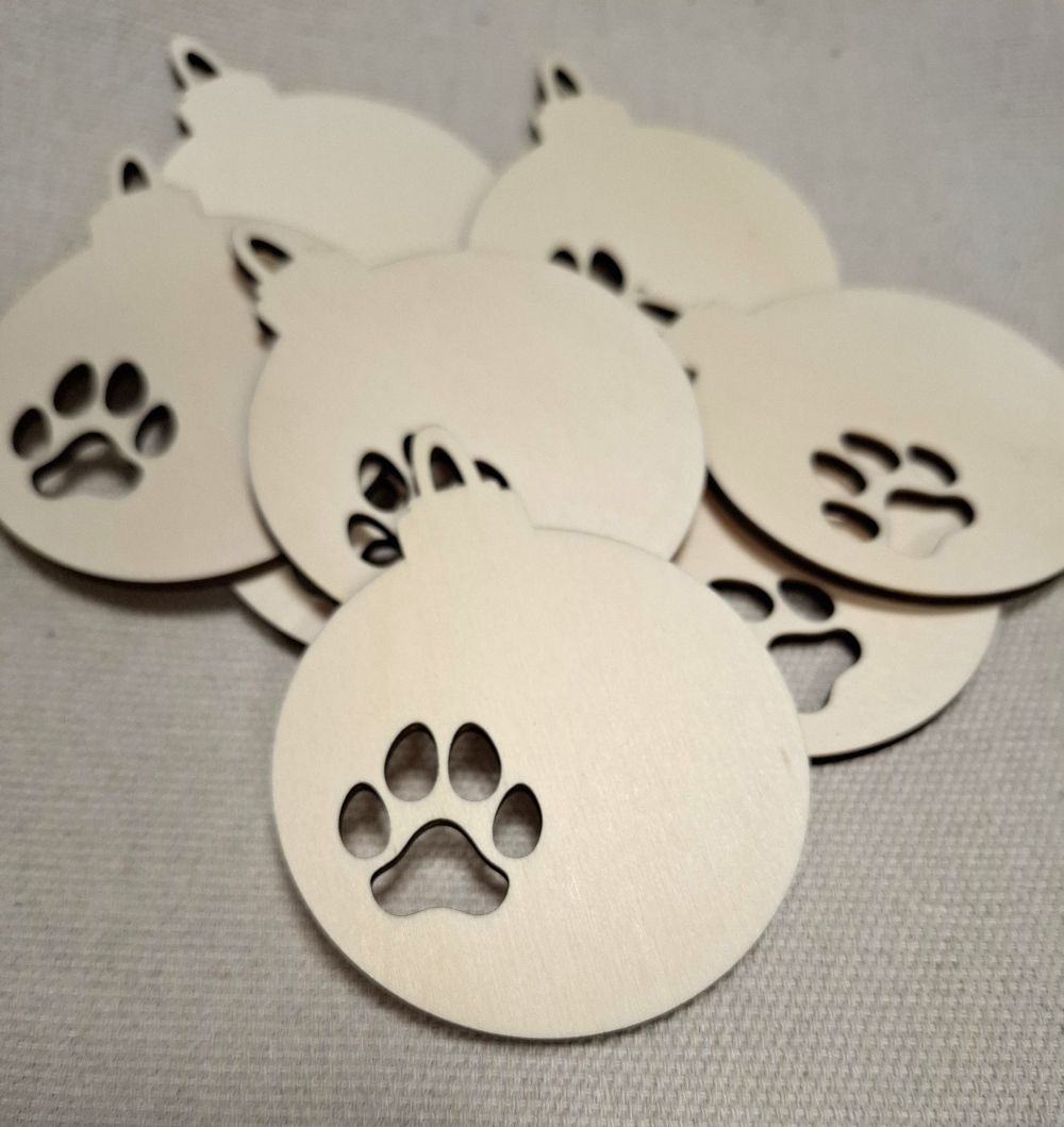 Weihnachtskugel aus Holz mit Pfotenabdruck – Lasergeschnittenes Sperrholz-Ornament zum Bemalen (7,5 x 9,5 cm)
