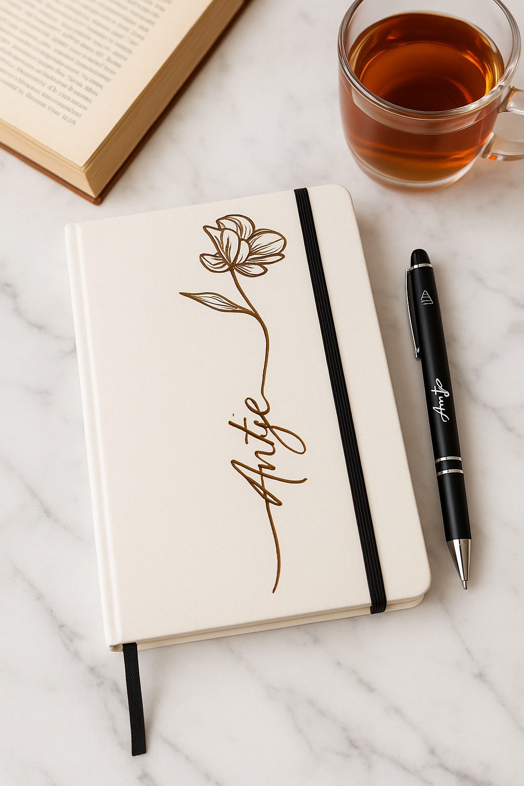 Erlebe stilvolles Schreiben mit Nachhaltigkeit - mit unserem personalisierten Notizbuch- & Kugelschreiber-Set, hochwertig lasergraviert und ganz nach deinem Wunsch mit individuellem Namen veredelt.